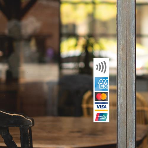 A double-sided sticker to place at your shopfront or point of sales to encourage your customers to know which payment types you are accepting by displaying this Vertical Multi Network Contactless Sticker.