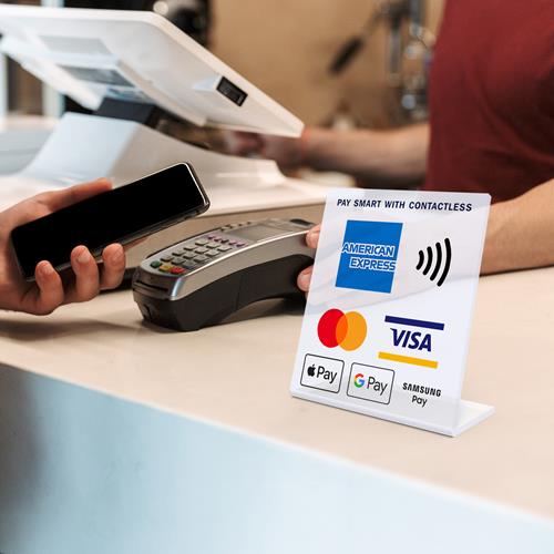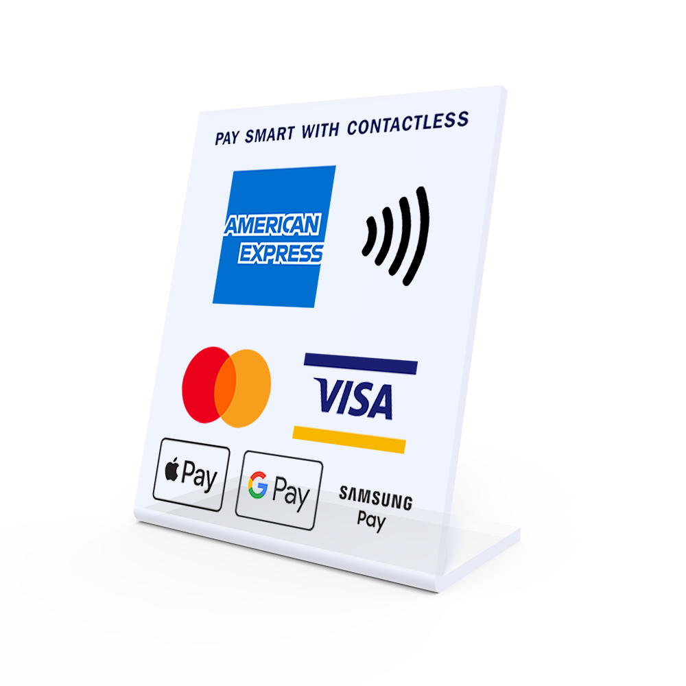Acrylic stand with ‘Pay smart with contactless’ insert that includes AMEX, Mastercard, Visa, Apple Pay, Google Pay and Samsung Pay.