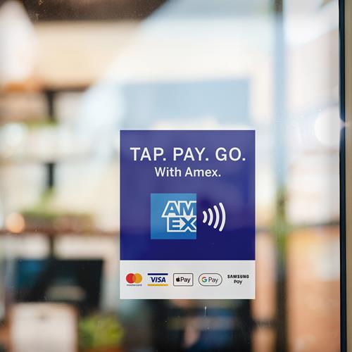 Tap.Pay.Go with Amex – Compact double-sided sticker to place at your shopfront or point-of-sale terminal, featuring Amex, Mastercard, Visa, Apple Pay, Google Pay and Samsung Pay – perfect for quick and easy payments at any counter!