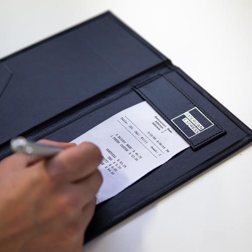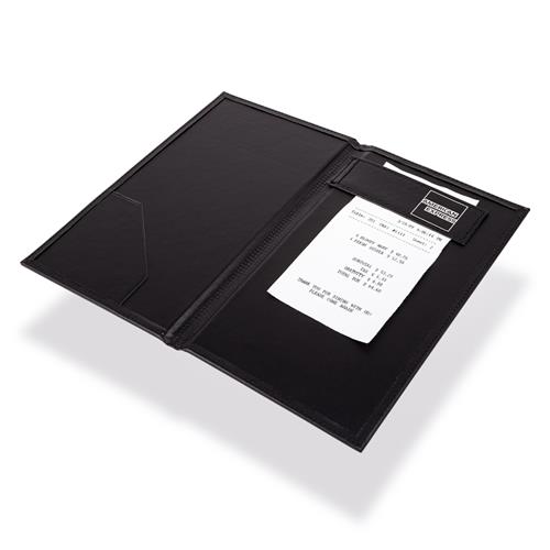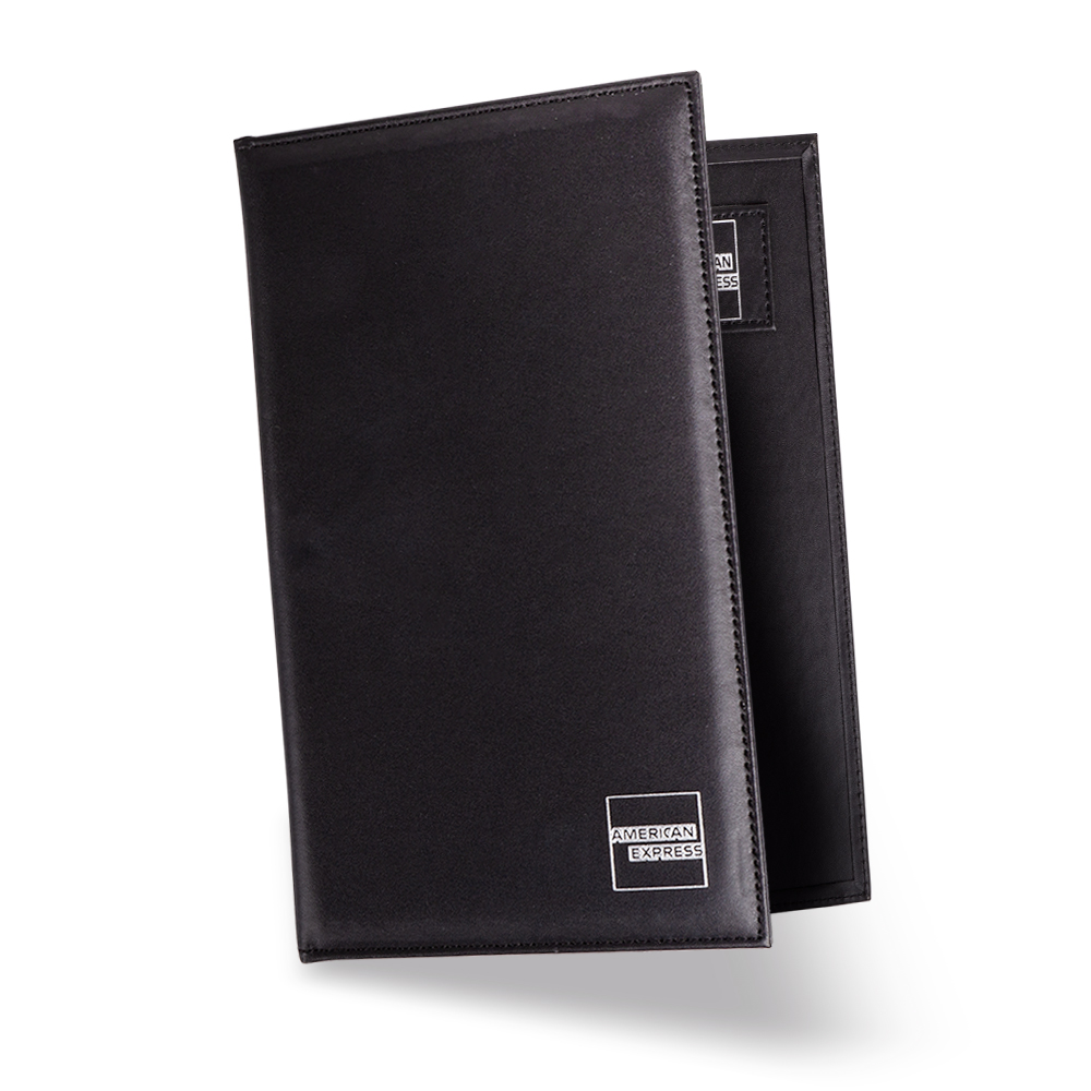 This sleek, modern and luxurious leather-look bill folder features the American Express logo embossed on the front cover and includes a magnetic strip and receipt pocket inside.