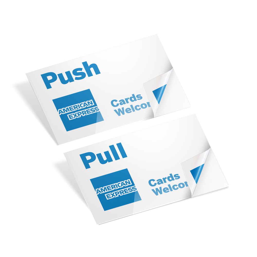 This premium double-sided sticker goes on the inside of your glass door to tell your customers which way to open the door and features our iconic Blue Box logo.